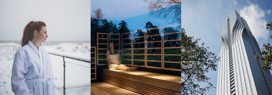 Som en del i en större leverans av bastur till Karlatornet i Göteborg inredde Tylö också Clarion Hotel Karlatornets spaavdelning. Här skapades en kombination av torrbastu med integrerade IR-paneler i väggarna för att skapa en mångsidig och unik wellnessupplevelse. Inredningen specialdesignades med ribbade väggar och tak i värmebehandlad asp för en elegant och modern känsla tillsammans med en belysningslösning specialanpassad för att harmoniera med designen.