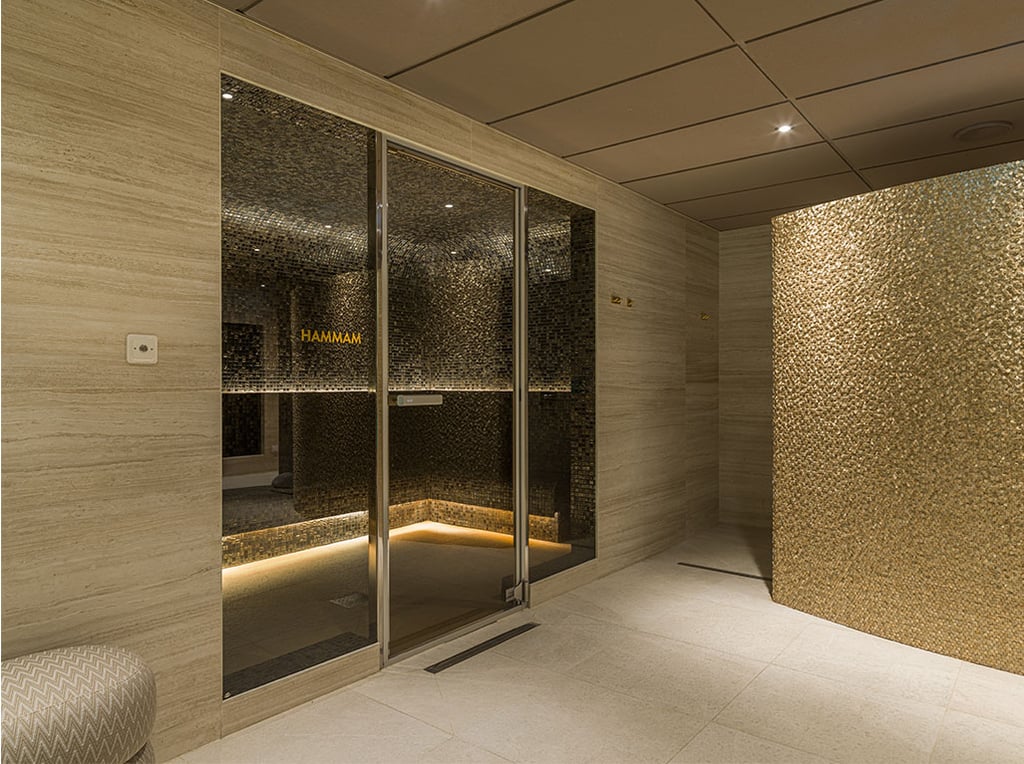 Maria Montecinos Franjola is the Interior Architect behind the concept. The design is focusing on earthy tones and materials like beige and gold colours. They also chose to upgrade their three different saunas with new products from Tylö, everything from interior to heaters.